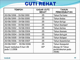 25 hari 30 hari 20 hari 25 hari ii bagi pegawai sedang berkhidmat yang dilantik mulai 1 September 2005 hingga 31 Disember 2008 dan menolak opsyen perubahan kadar kelayakan Cuti Rehat tahunan seperti yang ditawarkan di bawah PP Bil. 142008 juga kadar kelayakan Cuti Rehat tahunan bagi pegawai.